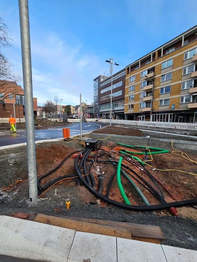 BU Kabel: Das Foto zeigt gut, welche Herausforderungen eine Großbaustelle wie die in der Stadtmitte mit sich bringt. Zusätzlich zu bereits vorhandenen Leitungen müssen auch noch neue gelegt werden. Gerade in der Stadtmitte, wo vieles zusammenläuft, wird es da oft eng. Baumpflanzungen sind von daher nicht ohne Weiteres überall möglich. Trotzdem wird es am Ende gelungen sein, im Baufeld mehr als 20 Bäume neu zu pflanzen.