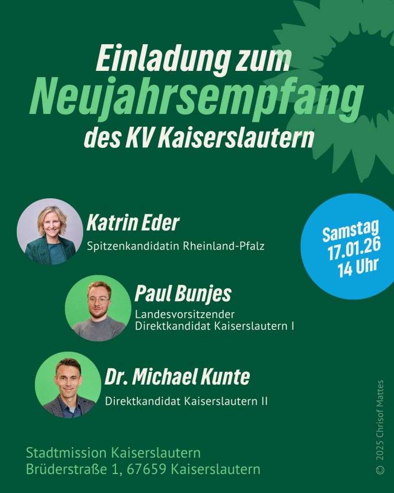 Der Kreisverband Kaiserslautern von BÜNDNIS 90/DIE GRÜNEN lädt Sie herzlich zum Neujahrsempfang 2026 ein.
