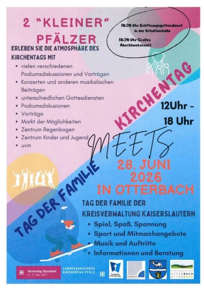 Wir laden ein zum 5. Tag der Familie des Landkreises Kaiserslautern, der in Kooperation mit dem Kleinen Kirchentag Otterbach am 28. Juni stattfindet – ein Event mit attraktiven Angeboten von Vereinen und Institutionen aus der Region.