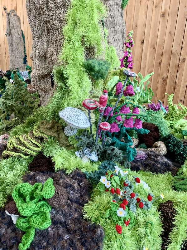 Die filigrane Ausstellung, bestehend aus mehreren Werken, ist das Ergebnis eines mehrmonatigen Projektes, bei dem der Wald mit der Häkelnadel zum Leben erweckt wurde. Tausende einzelne Elemente wurden kunstvoll arrangiert.