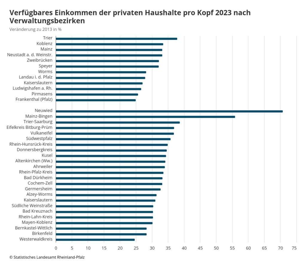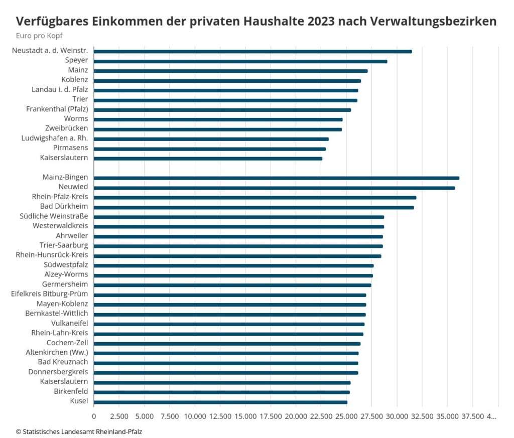 In den Landkreisen war das verfügbare Einkommen der privaten Haushalte je Einwohnerin bzw. Einwohner mit durchschnittlich 28.824 Euro höher als in den kreisfreien Städten mit 25.688 Euro. Im Vergleich der Landkreise erreichten die Einwohnerinnen und Einwohner in Mainz-Bingen mit 36.208 Euro das höchste Pro-Kopf-Einkommen; in Kusel waren es nur 25.147 Euro. Bei den kreisfreien Städten reichte die Spannweite von 22.631 Euro in Kaiserslautern bis 31.524 Euro in Neustadt.