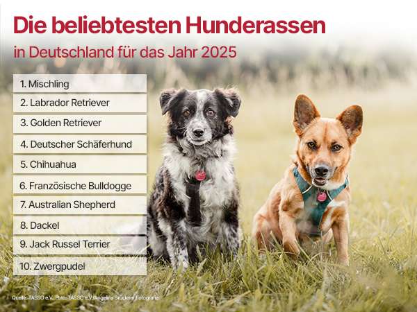 Bei den beliebtesten Hunden der Deutschen bleibt auch 2025 das vertraute Bild: Mischlinge führen die Top 10 weiterhin klar an – noch vor dem Labrador, der die Spitzenposition unter den reinrassigen Hunden behauptet. Das geht aus einer Auswertung der Tierschutzorganisation TASSO e.V., die Europas größtes kostenloses Heimtierregister betreibt, hervor. In der Zeit vom 01.01.2025 bis 31.12.2025 wurden mit gewohnt deutlichem Abstand am häufigsten Mischlinge neu bei TASSO angemeldet. 92.976 Neuregistrierungen entfallen alleine auf sie.