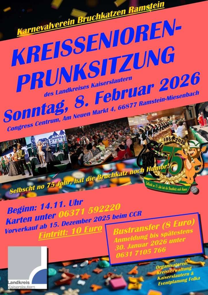 Traditionsgemäß wird auch in diesem Jahr im Landkreis Kaiserslautern die fünfte Jahreszeit bei der Kreissenioren-Prunksitzung am Sonntag, 8. Februar, gefeiert. Die Veranstaltung findet ab 14:11 Uhr im Congress Center Ramstein-Miesenbach (Am Neuen Markt 4, 66877 Ramstein-Miesenbach) statt. Alle Seniorinnen und Senioren des Landkreises sind herzlich zur Feierstunde unter dem Motto „Selbscht no 75 Johr, hat die Bruchkatz noch Humor!“ eingeladen.