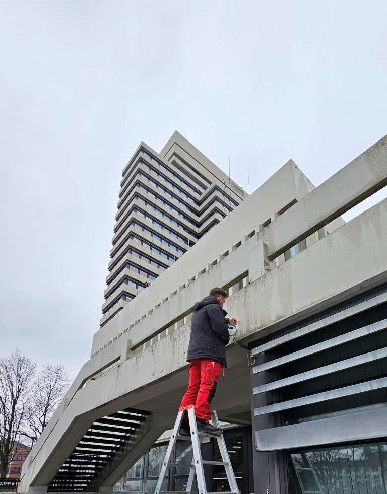 Am Rathaus werden derzeit die Kameras aufgehängt, die künftig der Videoüberwachung zum Schutz der Besucherinnen und Besucher sowie der Mitarbeiterinnen und Mitarbeiter dienen werden. Insgesamt elf Kameras werden installiert, sieben am Rathausvorplatz und vier an den übrigen Seiten des Gebäudes. Rund um das Rathaus werden künftig Schilder auf den Videoschutz hinweisen. Der geplante Videoschutz ist Teil eines größeren und seit längerem geplanten Sicherheitskonzepts, dessen Ziel es ist, Vandalismus, Drogenkriminalität und tätlichen Angriffen im direkten Umfeld des Rathauses entgegenzuwirken. Formell möglich wurde die Installation nun durch den Beschluss des Bauausschusses am Montag, den Rathausvorplatz als öffentliche Fläche einzuziehen und somit als städtisches Privatgrundstück einzustufen.