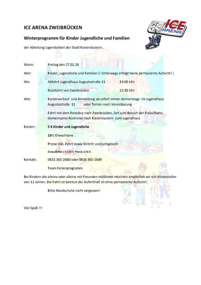 Die Abteilung Jugendarbeit der Stadt Kaiserslautern bietet am Freitag, 27. Februar 2026, für Kinder, Jugendliche und Familien eine Fahrt in die Ice Arena Zweibrücken an. Los geht es mit dem Reisebus am Jugendhaus in der Augustastraße 11 um 19 Uhr. Die Ice Arena verspricht viel Spaß beim Eislaufen, bevor um 22.30 Uhr wieder die Rückfahrt von Zweibrücken angetreten wird.