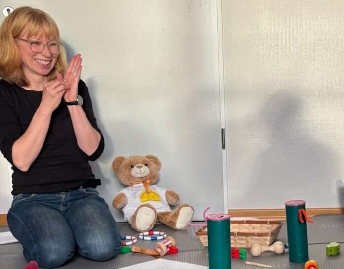 Eine Szene aus einer Kursstunde zeigt, wie unmittelbar die Verständigung funktioniert. Während Swenja Broschart mit den Eltern ein bekanntes Kinderlied singt, verfolgt ein eineinhalbjähriger Junge aufmerksam die Bewegungen. Kaum ist das Lied zu Ende,