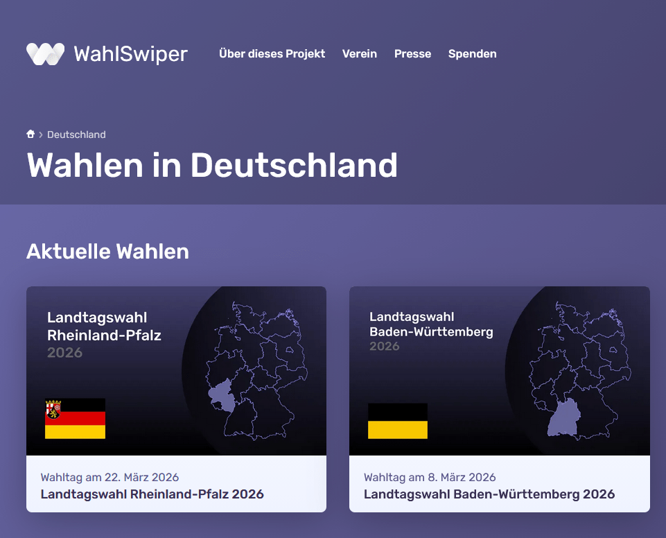 Zur Landtagswahl am 22. März 2026 in Rheinland-Pfalz ist heute der WahlSwiper online gegangen. Auch für die Wahl am 8. März 2026 in Baden-Württemberg steht die beliebte Wahlhilfe-App bereits zur Verfügung.