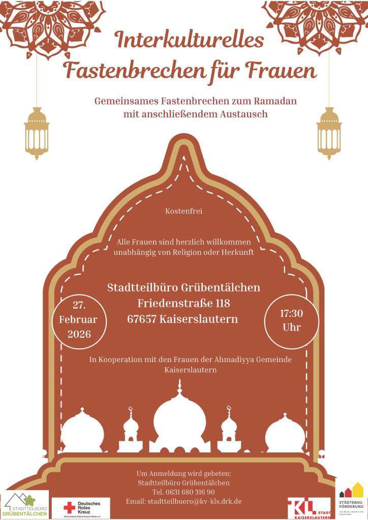 Im Rahmen des Monats Ramadan lädt das Stadtteilbüro Grübentälchen am 27. Februar um 17:30 Uhr zu einem interkulturellen Fastenbrechen für Frauen ein. Die Veranstaltung findet in Kooperation mit den Frauen der Ahmadiyya Gemeinde Kaiserslautern im Stadtteilbüro Grübentälchen statt. Eingeladen sind alle Frauen aus dem Stadtteil und darüber hinaus, unabhängig von Religion oder Herkunft. Ziel des Abends ist es, gemeinsam das Fasten zu brechen, miteinander ins Gespräch zu kommen und einen offenen Austausch zu ermöglichen. Im Mittelpunkt steht ein gemeinsames Buffet mit selbst zubereiteten Speisen, begleitet von einem kurzen inhaltlichen Impuls zum Thema Ramadan. Die Veranstaltung ist kostenfrei.