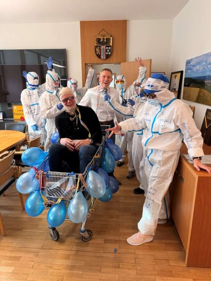Am heutigen Donnerstag, 12. Februar, blieb auch im Landkreis Kaiserslautern kein Krawattenknoten sicher: Pünktlich zur Weiberfastnacht stürmten rund ein Dutzend närrische Damen der Kreisverwaltung – in weißen Schutzanzügen gekleidet sowie mit bunten Schriftzügen und Accessoires versehen – das Landkreisgebäude und machten kurzen Prozess mit den Modeaccessoires der männlichen Kollegen. Mit im Gepäck bzw. im Einkaufswagen dabei hatte der sogenannte „Fasnachts-Krisenstab“ den Personalratsvorsitzenden Thorsten Haury.