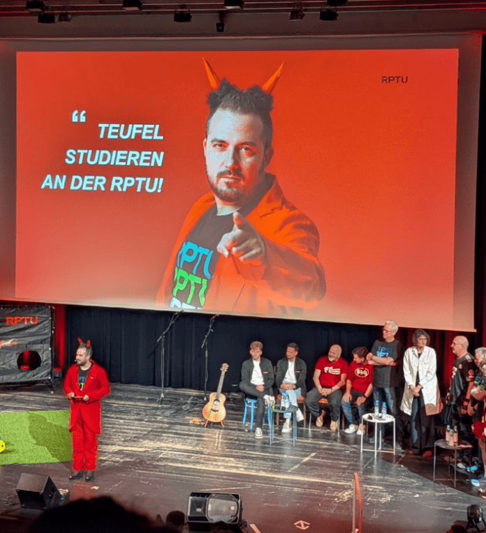 Vor und nach der Show-Vorlesung gab es auf dem Infomarkt die Gelegenheit, sich bei Erfrischungsgetränken im Foyer auszutauschen, mehr über Studienmöglichkeiten der RPTU zu erfahren – und mit etwas Glück eines von drei signierten FCK-Trikots zu gewinnen. Für die passende Atmosphäre sorgte als Special Act die Band „Die Anonyme Giddarischde“.