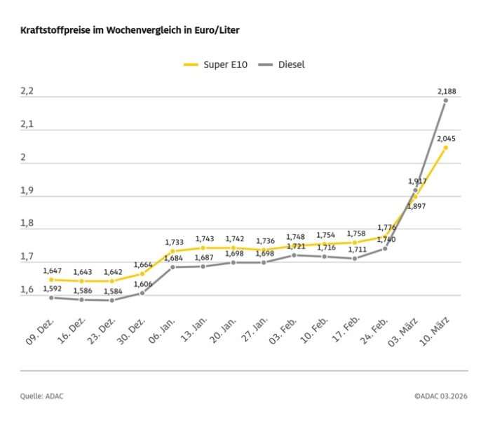 Die Kraftstoffpreise in Deutschland sind im Wochenverlauf steil nach oben gegangen. Zu spüren bekommen die dramatische Verteuerung besonders die Diesel-Fahrer, deren Kraftstoff innerhalb einer Woche um 27,1 Cent je Liter gestiegen ist. Aber auch Benzin hat sich massiv verteuert: Super E10 kostet aktuell 14,8 Cent mehr als in der Vorwoche. Wie der ADAC in seiner wöchentlichen Auswertung der Kraftstoffpreise in Deutschland ermittelt hat, muss man derzeit für einen Liter Super E10 im bundesweiten Mittel 2,045 Euro (Preis in der Vorwoche 1,897 Euro) bezahlen. Diesel kostet im Schnitt 2,188 Euro (Vorwoche 1,917 Euro) und hat den Benzinpreise sehr deutlich überholt. Damit liegen die Preise beider Kraftstoffsorten gleichzeitig über der Marke von zwei Euro je Liter. Dies war letztmals am 7. September 2022 der Fall.