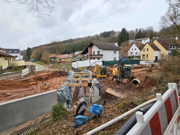 Wer an der Waschmühle regelmäßig in die Baugrube der neuen Brücke über den Eselsbach blickt, konnte in den vergangenen Tagen große Fortschritte erkennen. So wurden inzwischen die Tiefgründung mit 65 Gewindepfählen hergestellt und auch die Widerlagerwände betoniert. Als Widerlager bezeichnet man den Unterbau der Brücke am Übergang zwischen der Brückenkonstruktion und dem Erddamm. Auch die 20 Meter lange Stützwand entlang des Bachlaufs im Bereich vor der Brücke wurde bereits betoniert. Aktuell ist geplant, Anfang April mit der Herstellung des Überbaus zu beginnen und Mitte April mit den Straßenbaumaßnahmen, so dass die Maßnahme voraussichtlich Ende Juni abgeschlossen sein dürfte. Der Eselsbach wurde im Bereich der Baustelle vorübergehend verrohrt, bis zum Abschluss der Maßnahme wird das Bachbett naturnah wiederhergestellt.