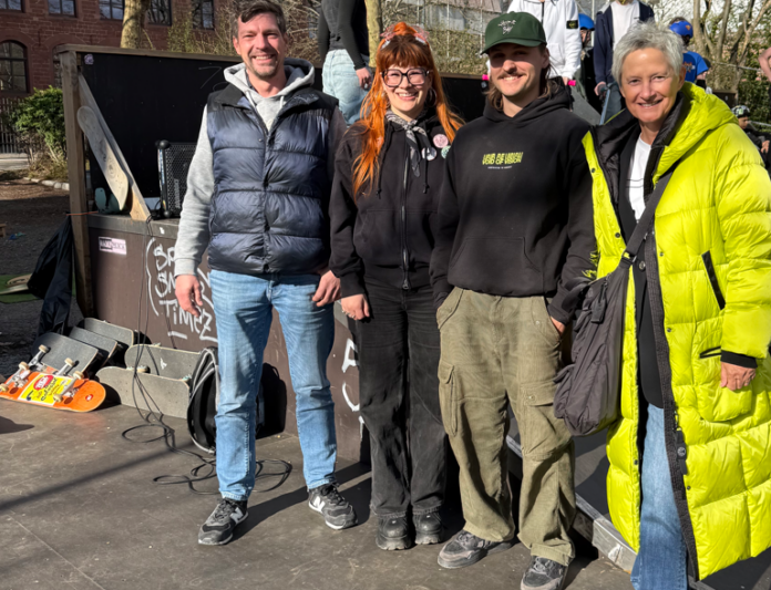 Bild: vlnr. Constantin Weidlich, Clair Baumgardt-Kallay, Tim Kopta und Oberbürgermeisterin Beate Kimmel eröffnen die Skate-Bahn