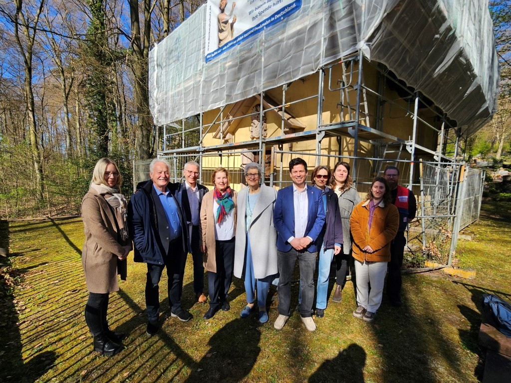 Bei der Besichtigung der Huberkapelle waren auch Udo Holzmann, Leiter des Referats Gebäudewirtschaft, Mira Oliveira von der Bauausführung und Gebäudeerhaltung des Referats Gebäudewirtschaft und Gerhard Prottung, Leiter des Referats Grünflächen, sowie Vertreterinnen der Generaldirektion Kulturelles Erbe Rheinland-Pfalz, Klaus Meckler von den Architekten und Ingenieuren Meckler+Partner und Carsten Hehrlein von der Dachdeckerei Philipp Hehrlein zugegen.