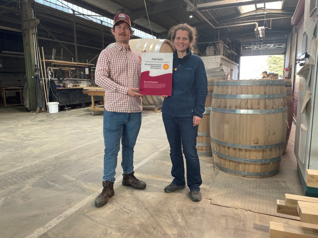 „Wir sind ein Familienbetrieb und identifizieren uns stark mit dem Pfälzerwald. Er hat für uns eine wichtige Bedeutung als Quelle nachwachsender und nachhaltiger Ressourcen“, sagte Jonas Eder beim Gang durch die Küferei in Bad Dürkheim, zu der auch eine hauseigene Schreinerei und ein Sägewerk gehören. Er zeigte der Direktorin des Biosphärenreservats Pfälzerwald-Nordvogesen, Dr. Friedericke Stakelbeck, wo maßgefertigte Fässer, Möbel und Spezialanfertigungen für unterschiedlichste Einsatzzwecke entstehen. Anlass des Besuchs war die Aufnahme der Wilhelm Eder GmbH in das Partnernetzwerk des Biosphärenreservats. „Bei uns trifft traditionelle Handwerkskunst auf moderne Kreislaufwirtschaft. Wir stellen mit Leidenschaft fürs Handwerk Unikate her und nutzen dazu ausschließlich zertifiziertes oder recyceltes Holz.“ Es sei ihm ein großes Anliegen gewesen, Partnerbetrieb im Biosphären-Netzwerk zu werden: „Wir bringen uns aktiv in den Umweltschutz ein,“ erklärt er und zählt Maßnahmen auf, die neben dem Pflanzen von Bäumen auch die Patenschaft für einen im Pfälzerwald ausgewilderten Luchs beinhalten. „Unsere Vision ist es, das Bewusstsein für die Bedeutung des Waldes zu stärken. Er spielt auch für mich persönlich eine große Rolle. Er ist für mich ein Ort zum Nachdenken, zum Spazieren mit dem Hund und zur Erinnerung daran, dass wir alle nur ein kleiner Teil eines größeren Ganzen sind.“