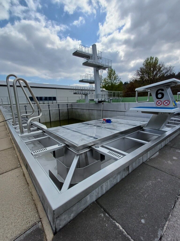 BU: Das neue Edelstahl-Springerbecken im Warmfreibad während der Reinigung am 14. April