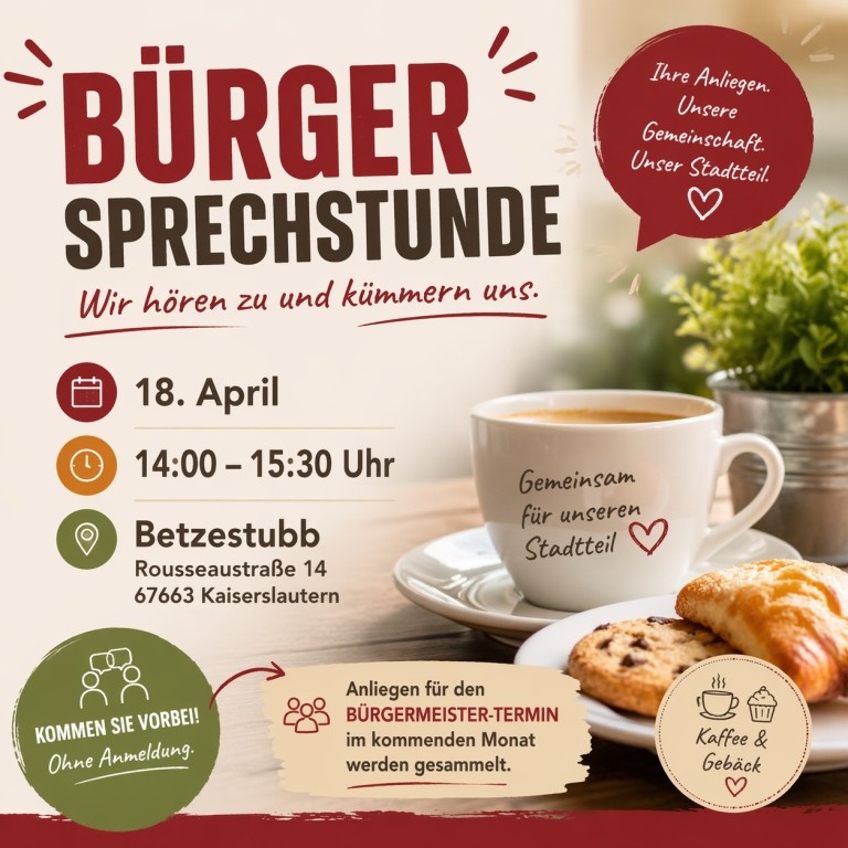 Die Veranstaltung findet im Stadtteilbüro Betzenberg „die Betzestubb“, Rousseaustraße 14, 67663 Kaiserslautern, statt. In gemütlicher Runde bei Kaffee und Gebäck können persönliche Themen angesprochen, Probleme geschildert oder Ideen für den Stadtteil eingebracht werden. Häufig geht es dabei um ganz praktische Fragen aus dem Alltag – etwa zu Wohnen, Nachbarschaft, Behördenangelegenheiten oder lokalen Projekten. Wo möglich, wird direkt geholfen, ansonsten werden Anliegen aufgenommen und weiterverfolgt.