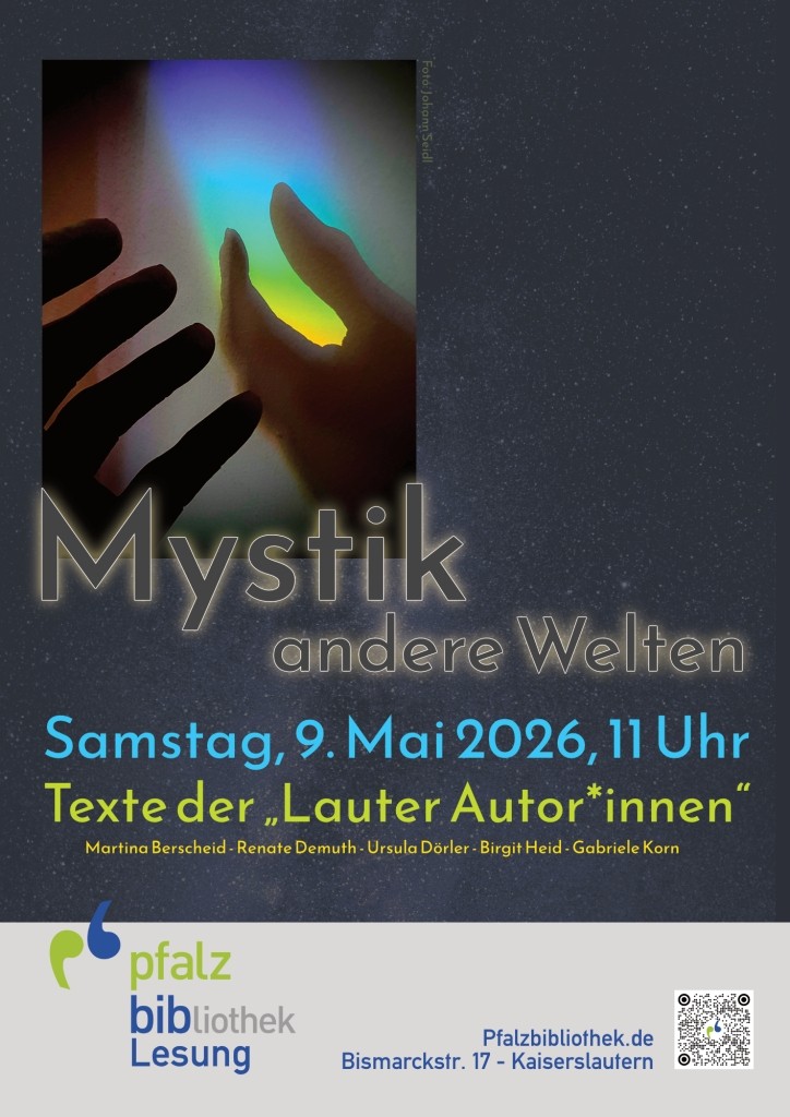 Am 9. Mai 2026, um 11.00 Uhr sind gleich sechs der „Lauter Autor*innen“ zu Gast in der Pfalzbibliothek und stellen ihre Texte aus der neuen Anthologie zum Thema Mystik vor. Es lesen Ursula Dörler, Martina Berscheid, Renate Demuth, Gabriele Korn, Birgit Heid und Bettine Wagner-Friedewald.