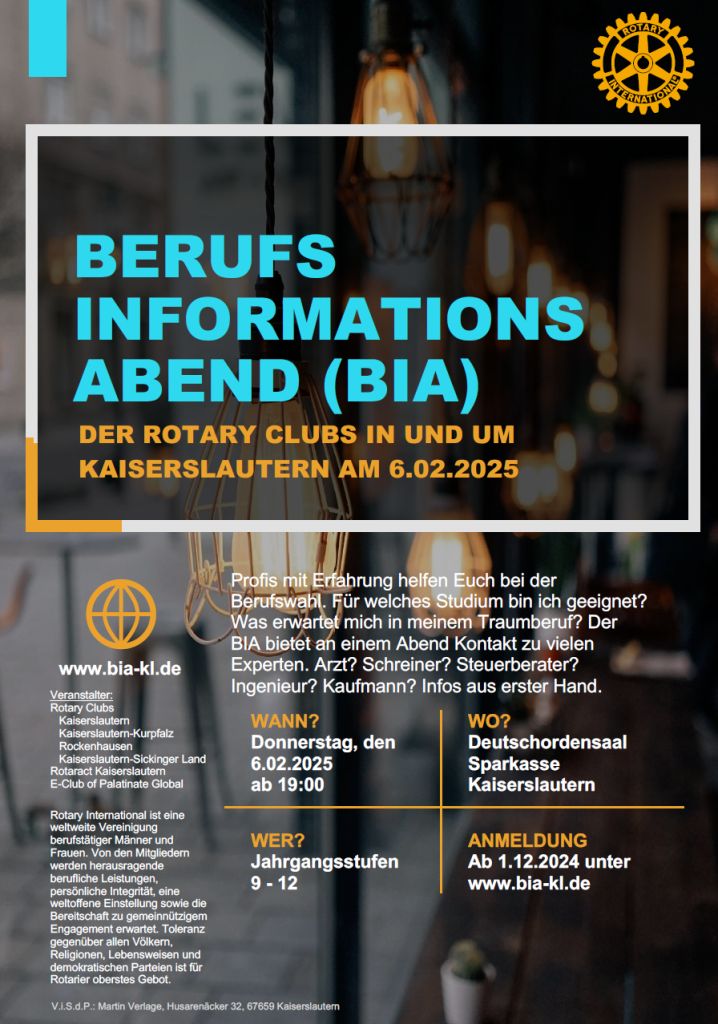 Am 6. Februar 2025 laden die Rotary Clubs Kaiserslautern, Kaiserslautern-Kurpfalz, Rockenhausen, Kaiserslautern-Sickinger Land und der Rotary E-Club of Palatinate Global Schülerinnen und Schüler der Jahrgangsstufen 9 bis 12 zum Berufsinformationsabend (BIA) ein. Die Veranstaltung beginnt um 19:00 Uhr im Deutschordensaal der Sparkasse Kaiserslautern.