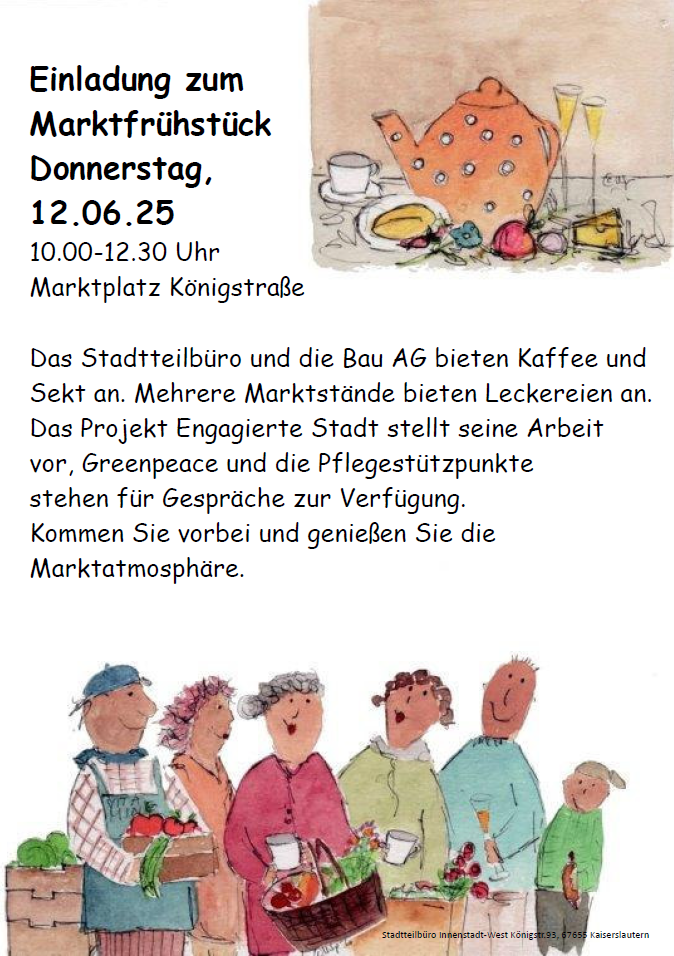 Am 12.6.25 findet von 10 bis 12.30 Uhr ein Marktfrühstück auf dem Donnerstagsmarkt in der Königstraße statt. Bei einem etwas verändertem Konzept stellen sich verschiedene Institutionen an Ständen, rund über den Markt verteilt, vor. Leckeres zum Frühstück oder zur Mittagspause kann an verschiedenen Marktständen erworben werden. Am Stand des Stadtteilbüros wird Kaffee ausgeschenkt und wer möchte, kann sich die Einkäufe mit dem Lastenrad in die nähere Umgebung nach Hause fahren lassen. Die Bau AG bietet Sekt an und stellt den Stadtteiltreff in der Königstr. 59 vor.