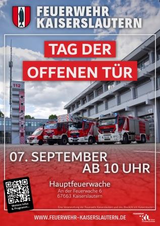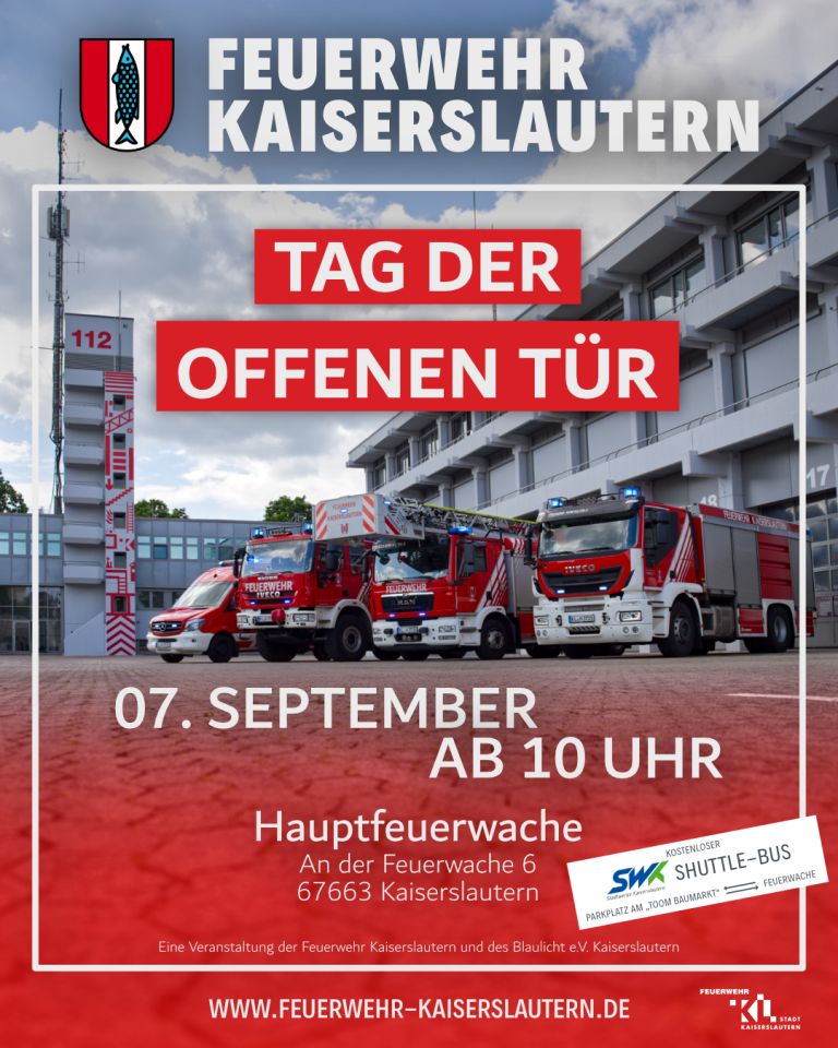 Die Feuerwehr Kaiserslautern lädt am 07.09.2025 ab 10 Uhr alle interessierten Bürgerinnen und Bürger zum Tag der offenen Tür auf der Hauptfeuerwache in Kaiserslautern ein. Wir bieten ein vielfältiges Programm für Groß und Klein, einen spannenden Einblick in die Arbeit der Berufsfeuerwehr sowie der Freiwilligen Feuerwehr, Besichtigung der Feuerwache und der Feuerwehrfahrzeuge und vieles mehr. […] |
