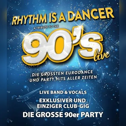 90er Party mit Liveband und Vocals Irish House, Eselsfürth 11, 67657 Kaiserslautern 14.11.2025 - 20:30 Einlass ab 14.11.2025 19:30 Uhrbis 14.11.2025 20:30 Uhr Rhythm is a Dancer A Tribute to the 90s Hit-Garante zum Mitsingen und -tanzen. Die Hymnen der 90er Jahre und des Eurodance bedeuten Partystimmung pur. Snap, Dr. Alban, Mr. President, La Bouche, […] |